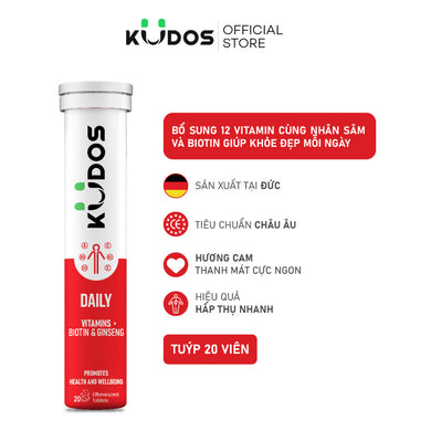 02 Boxes - Viên sủi vitamin tổng hợp và Nhân sâm + Biotin KUDOS DAILY giúp khỏe đẹp mỗi ngày hương Cam (20 viên/ Tuýp)